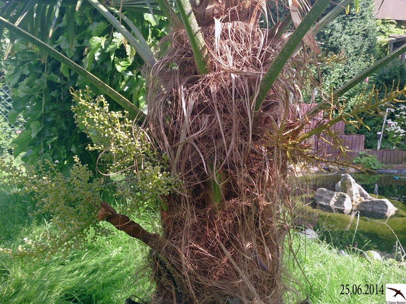 wie schon Bekannt hatte ich den Blütenstaub von Deiner männlichen Wagnerianus an meiner weiblichen Trachycarpus fortunei an den Blüten auf der westlichen Seite angebracht.Es ist ein Erfolg , denn an der östlichen hatte ich nichts verteilt.