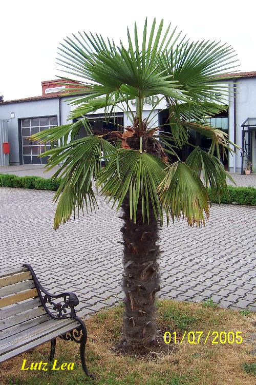 Seit 2000 ausgepflanzt gedeiht jene ganz gut. Nach Auskunft des Inhabers bekommt die Hanfpalme zusätzlich zum Regen so gut wie kein Wasser und Dünger. Dadurch ist der Blattzuwachs recht gering, aber das Blattwerk ist steinhart.
