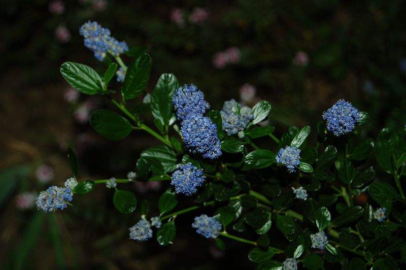 /*Ceanothus impressus Victoria*/ mit Massenblüte (im Hintergrund schwach sichtbar eine rosafarbene Hebenart)