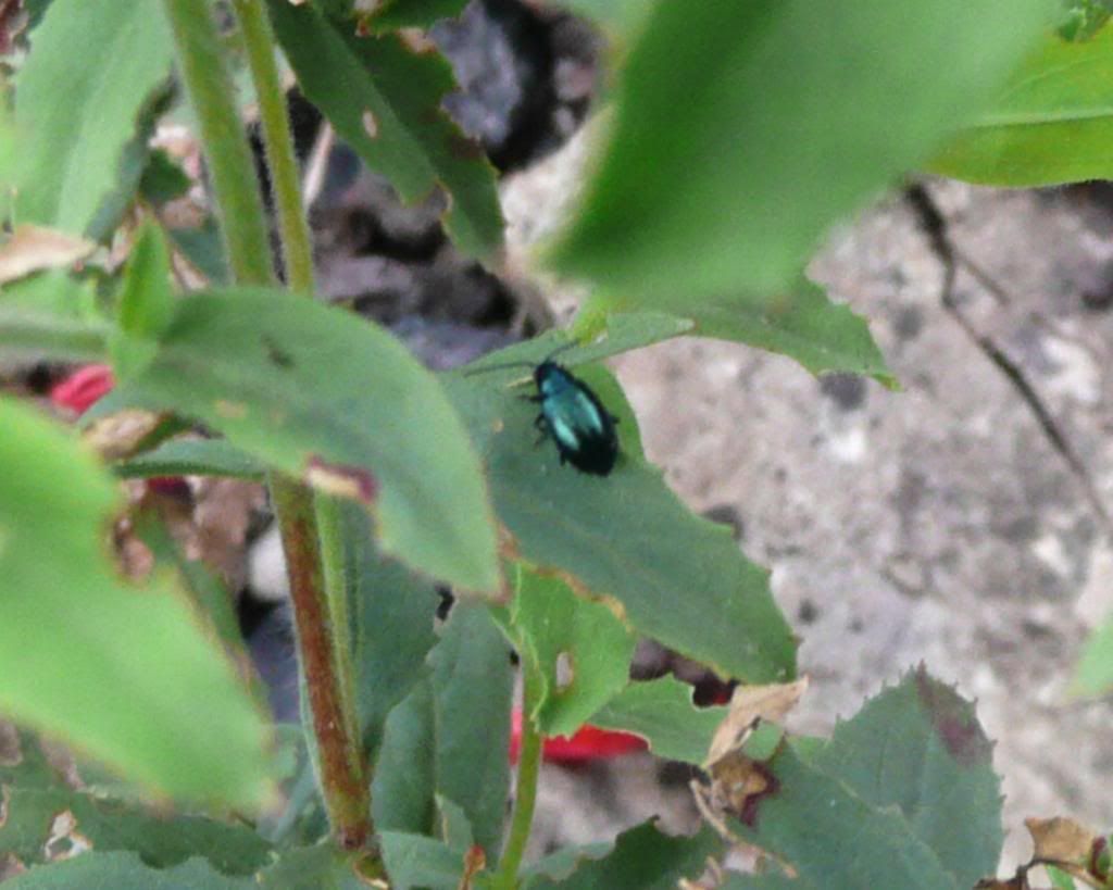 Kaum bemerken einen die kleinen, metallisch schillernden Tierchen, schwupp haben sie sich mit einem beherzten Satz in Sicherheit gebracht. Vermutlich sind es Flohkäfer, Altica spec. - die denen und anderen Onagraceaen, Epilobium oder Oenothera z. B. auch in den Staaaten ziemlich zusetzen.