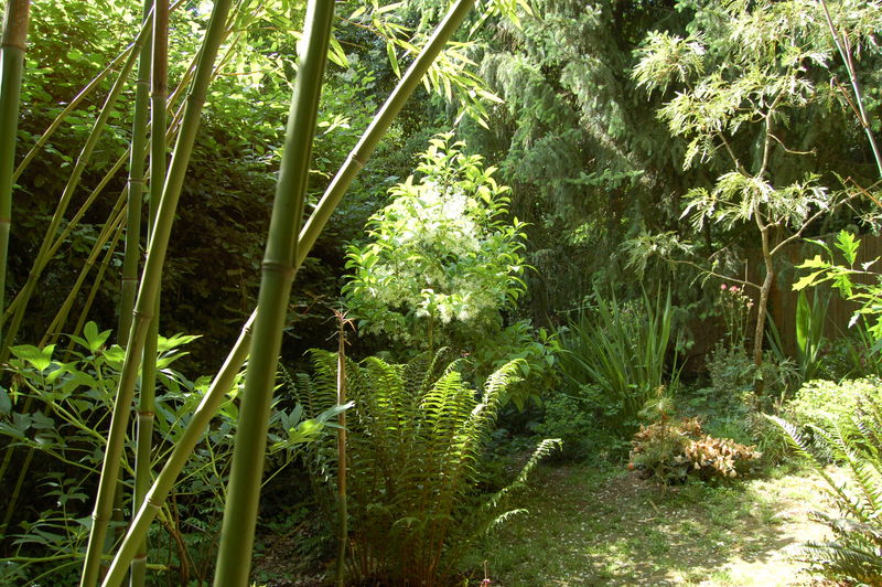 Hinten rechts in einer kleinen "Waldlichtung" /*Quercus dentata Pinnatifida*/, die Samurai-Eiche, neben dem ebenfalls fast verblühten Chionanthus virginicus, re vorne noch ein Blatt der immergrünen Quercus bastardica Lübbert zu erkennen