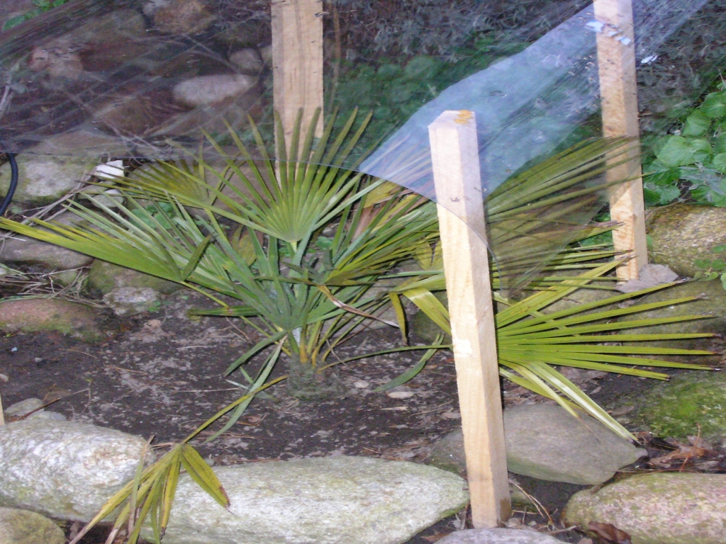 Was ein wenig Schutz doch ausmacht. Die von vielen als deutlich empfindlicher als Trachies angesehene Zwergpalme. Gepflanzt Frühjahr 2004, nahe der Hauswand, aber -13° hatte es da auch auf jeden Fall.