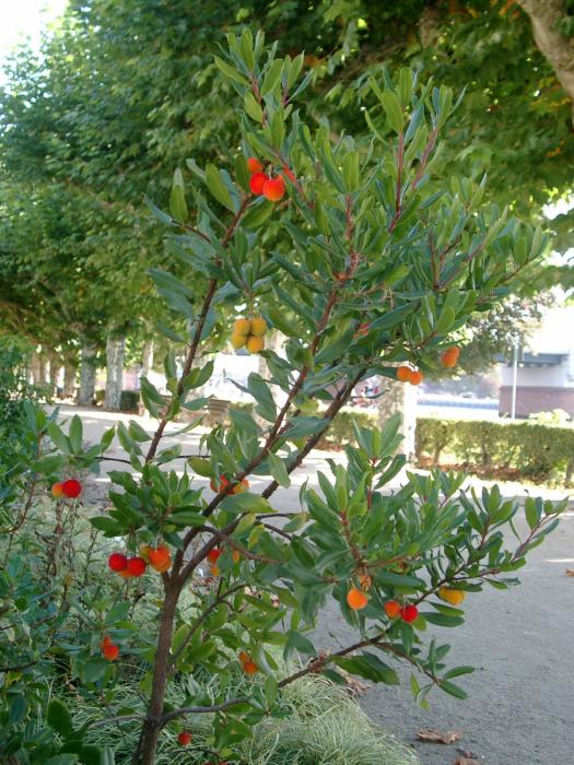 Ein Arbutus hat schon schöne, rot leuchtende Früchte.