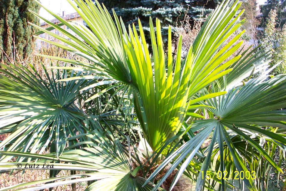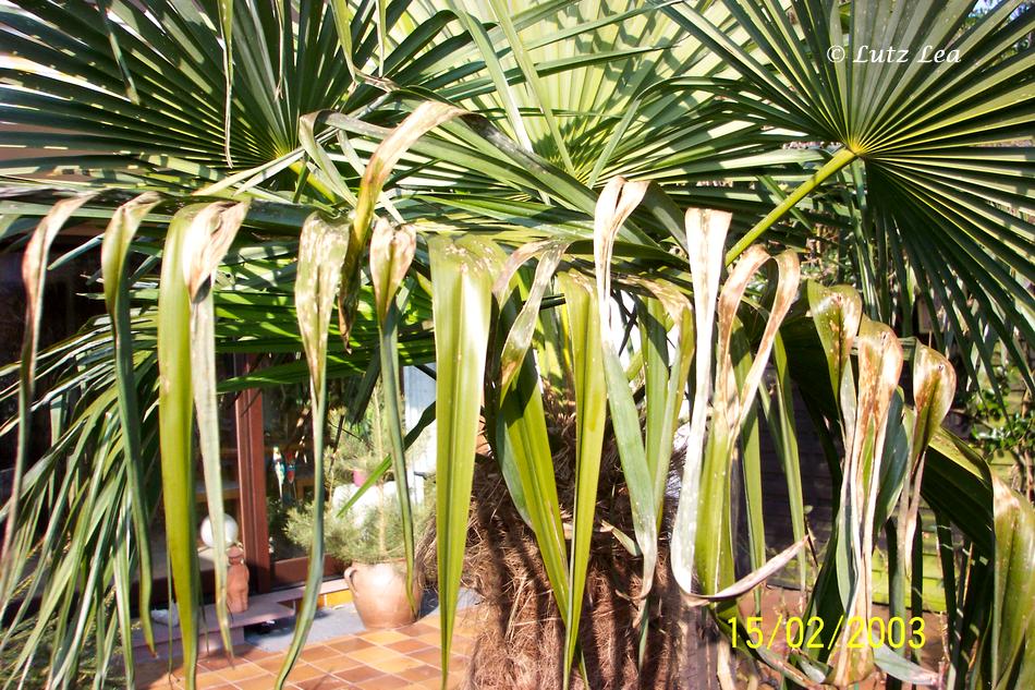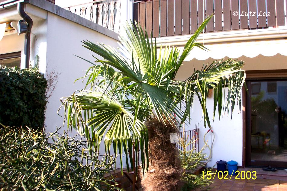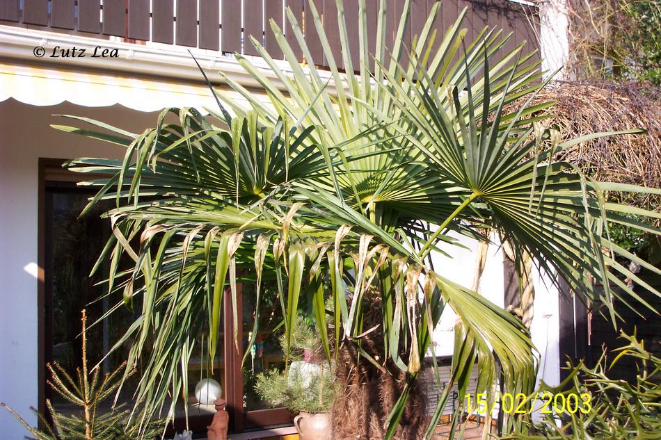 Der 2001 ausgepflanzte Trachy an der Terrasse hat im Winter 2002 (am 6.01.) mit -16,7°C schon mal "leicht" eins auf die Mütze bekommen.