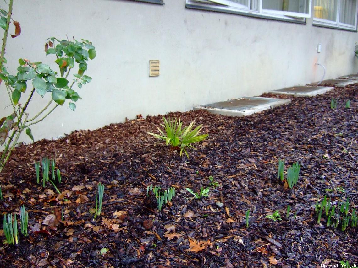 Immerhin haben die Gärtner die Palme stehen gelassen, als das Beet im letzten Herbst vom Unkraut befreit wurde. Noch dazu wurde etwas Rindenmulch verteilt.