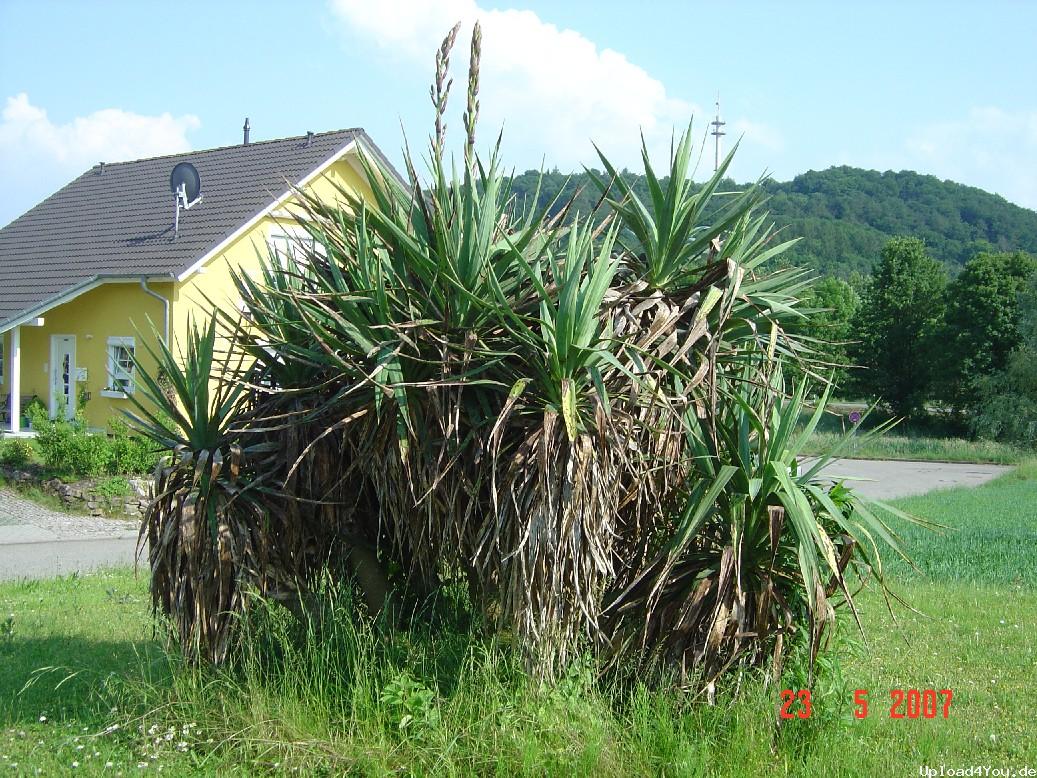 In Sinsheim fand ich diese ältere Gruppe von Yucca recurvifolia. Sie stand mitten im freien Feld. Anscheinend kümmert sich auch keiner darum (man sieht es an den vielen alten abgestorbenen Blättern). Wer mag sie wohl dort hingepflanzt haben?