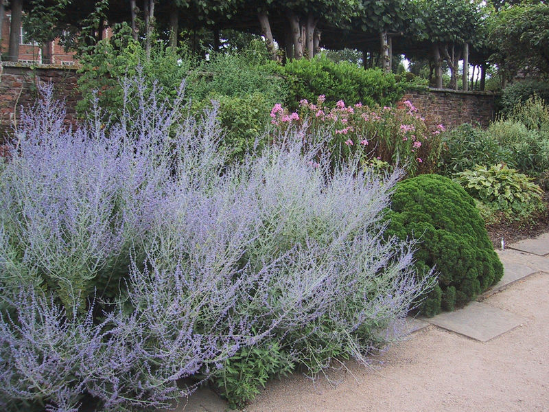 /*Perovskia atriplicifolia*/, eine ideale Steppengartenpflanze mit rel. langer Blühdauer (dahinter eine sehr langsam wachsende Hebenart)