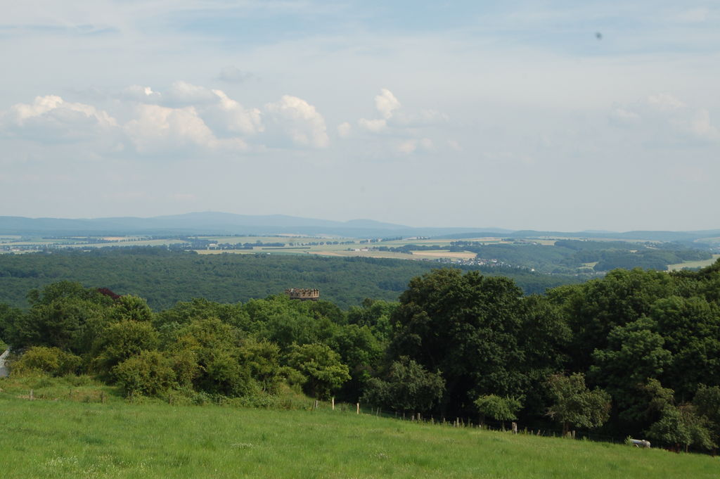 am Horizont mit höchster Erhebung der Feldberg (Taunus) re etwa i.d. Mitte des Bildes der Kleine Feldberg, vorne die Turmspitze des Schosses Dehrn/Lahn (Ri:Süden) AM#