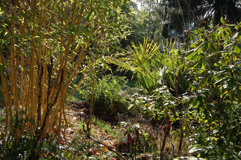 /*Phyllostachys bambusoides Castillonii*/li ,in der Bildmitte /*Danae racemosa*/ dazwischen überall austreibende Baumpaeonien!