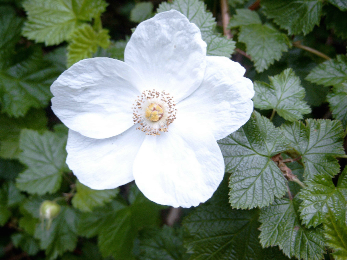hier mal ein problemlos winterharter Exot: Rubus deliciosus. Blueht gerade jetzt mit Blueten so gross wie die von Heckenrosen. Blaetter eher wie die von Johannisbeeren.