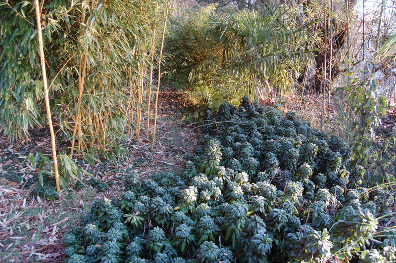 /*Euphorbia amygdaloides var. Robbiae*/ breitet sich zunehmend aus, re am Bildrand die immergrüne /*Sycoparrotia semidecidua*/, li /*Phyllostachys areosulcata aureocaulis*/