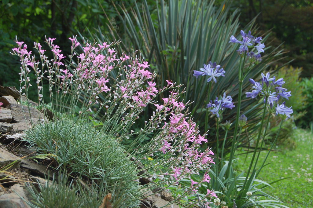 /*Acantholimon hohenackeri*/ neben Agapanthus africanus, im Hintergrund Yucca x karlsruhensis.Von meinen zahlreichen Etablierungsversuchen mit diesem wunderschönen Zwerggehölz sind nur wenige übriggeblieben (nicht des Frostes wegen)