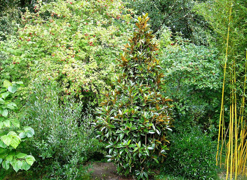 Ensemble mit /*Magnolia grandiflora *Alta**/ (neu erworben), ganz links Cercis chinensis *Avondale*, rechts daneben Phillyrea angustifolia (hat Fruechte angesetzt!), ganz rechts Phyllostachys aureosulcata *Spectabilisâ* (6,5 m), links unten davon Euonymus japonica, etwas hoeher Prunus tomentosa, und im Hintergrund der einheimische Schneeball Viburnum opulus, einer der schoensten Gartenstraeucher (Bluete, Herbstfärbung, rote glaenzende Fruechte, die von Amseln nicht gefressen werden und bis zum Fruehjahr aus der Szene herausleuchten.