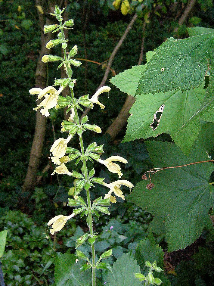 Am halbschattigen Waldrand treibt /*Salvia glandulosa*/ ihr Wesen. Rechts davon ein vertrockneter Bluetenstand und Blaetter von /*Rubus parviflorus*/.