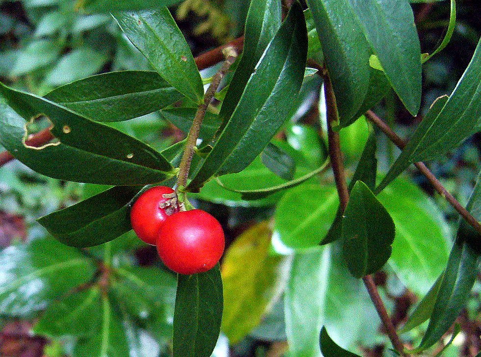 Eine /*Daphne*/, die ich nicht mehr sicher zuordnen kann, hat leuchtende Beeren hervorgebracht.