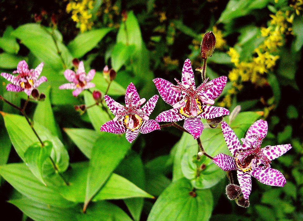 /*Tricyrtis hirta*/, im Hintergrund Solidago virgaurea.