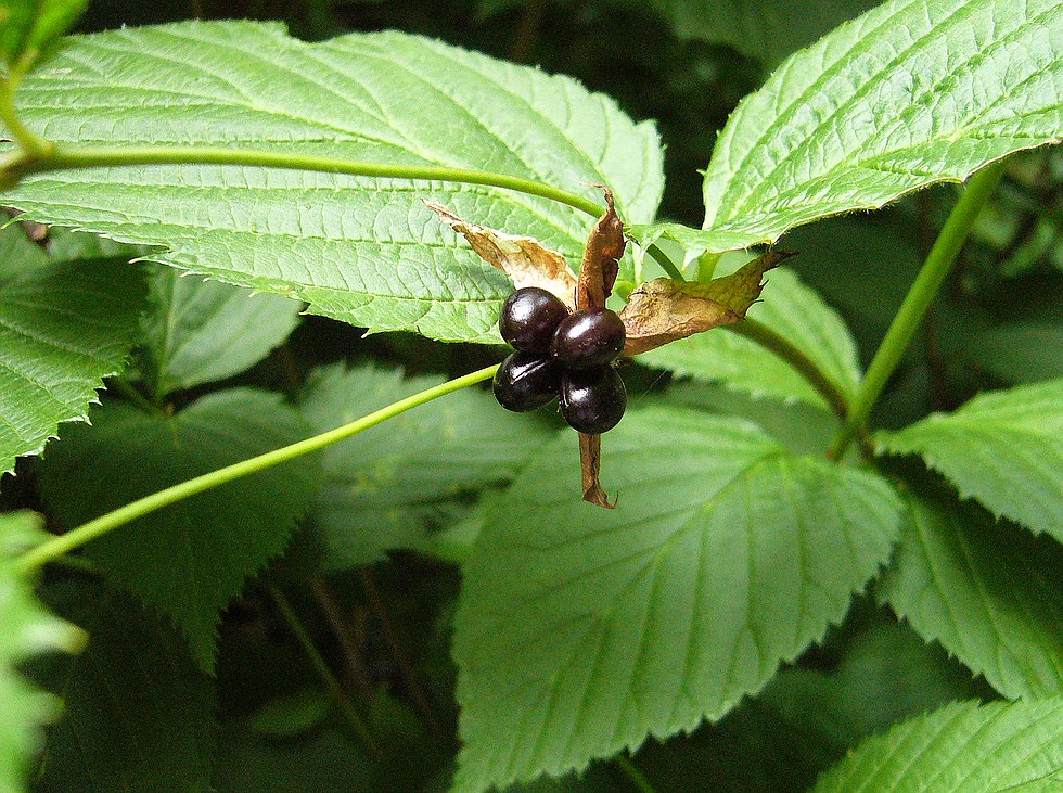 Dagegen hat /*Rhodotypos scandens*/ bereits reife Fruechtchen, die meist zu Viert angeordnet sind.
