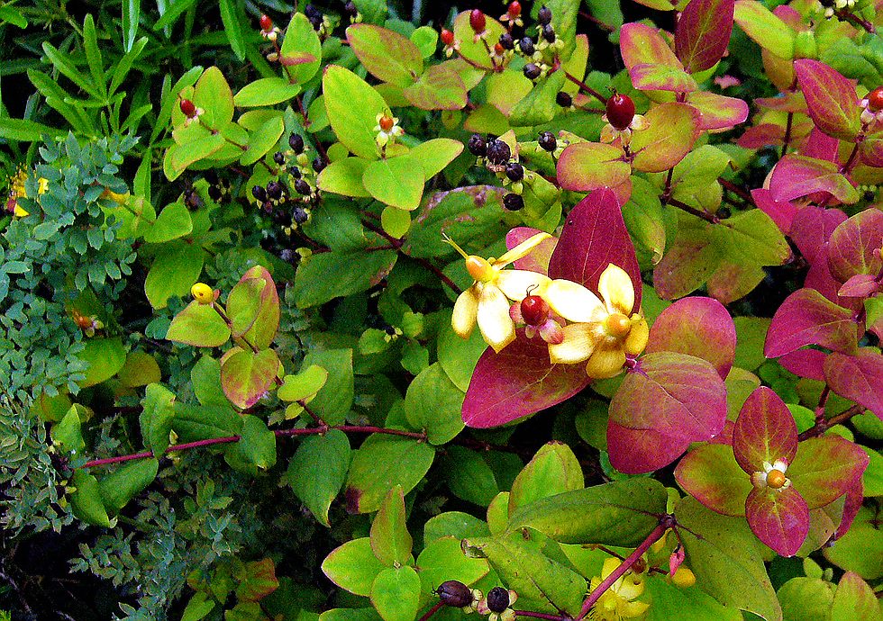 Farbenfroh präsentiert sich /*Hypericum inodorum *Rheingold**/ mit sehr jungen sowie fast reifen Fruchtkapseln und mit beginnender Herbstfaerbung. Links Amorpha canescens.
