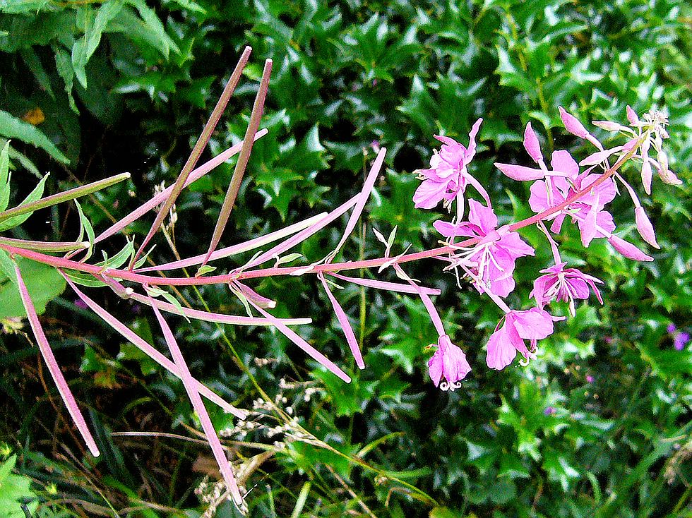 Zum Schluss eine einheimische Art, das Schmalblaettrige Weidenröschen (/*Epilobium angustifolium*/) vor Ilex cornuta.