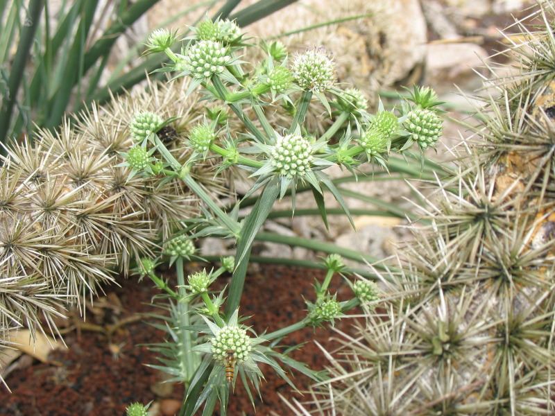 nicht auf ein einziges Foto bekomme ich Eryngium venustum. Ich habe diese Distel unter meine im letzten Winter verblichenen Cylindorpuntia imbricata gepflanzt und da schiebt sie nun ihren Blütenstand durch. Die Basis meiner Cylindropuntia habe ich stehen gelassen in der Hoffnung dass sie nach Verrottung von Haut und Stacheln als dekoratives Kakteenskelett noch eine Weile dem Xerophytenbeet erhalten bleibt??! Bisher allerdings ist dort noch äußerst vorsichtiges Hantieren angesagt