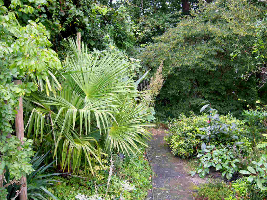 Hier (wieder von li nach re): /*Paliurus spina-cristi*/, Basis-Kindel einer 1,8 m hohen /*Yucca recurvifolia*/, dahinter /*Trachycarpus fortunei*/ (0,8 m Stamm ist verdeckt), /*Macleya cordata*/, /*Enkinathus campanulatus*/ im Hintergrund, davor u. a. /*Salix moupiensis*/ (blaugruen grossblaettrig, sehr schmuckvoll), Leucothoe walteri (kaum zu erkennen) und /*Viburnum davidii*/.