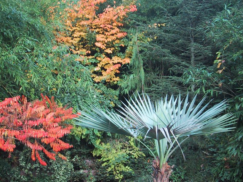 PS:Brahea armata(Kübelkultur) vor Rhus typhina laciniata,Poncirus trif. und Parrotia persica