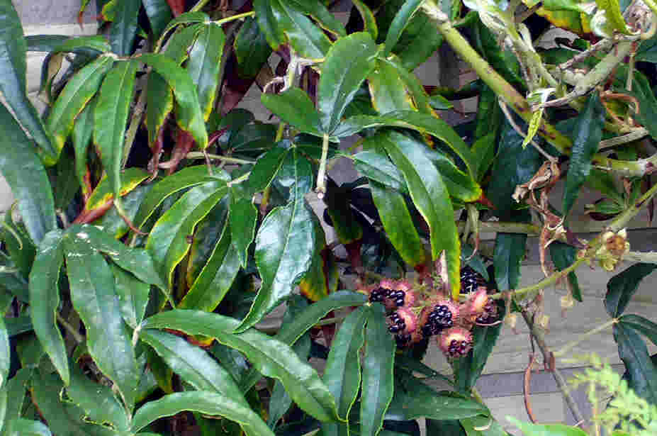 derzeit fruchtet /*Rubus henryi var. bambusarum*/, der in China in Bambusbestaenden sein Wesen treibt. Es ist eine immergruene Art, die sich hier als winterhart erwiesen hat und eine wirksame und ansprechende Wandbegruenung darstellt.