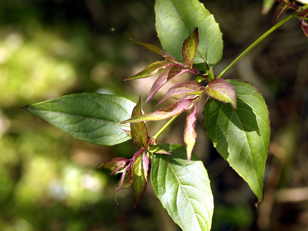 /*Leycesteria crocothyrsos*/ schöner rötlicher Austrieb.