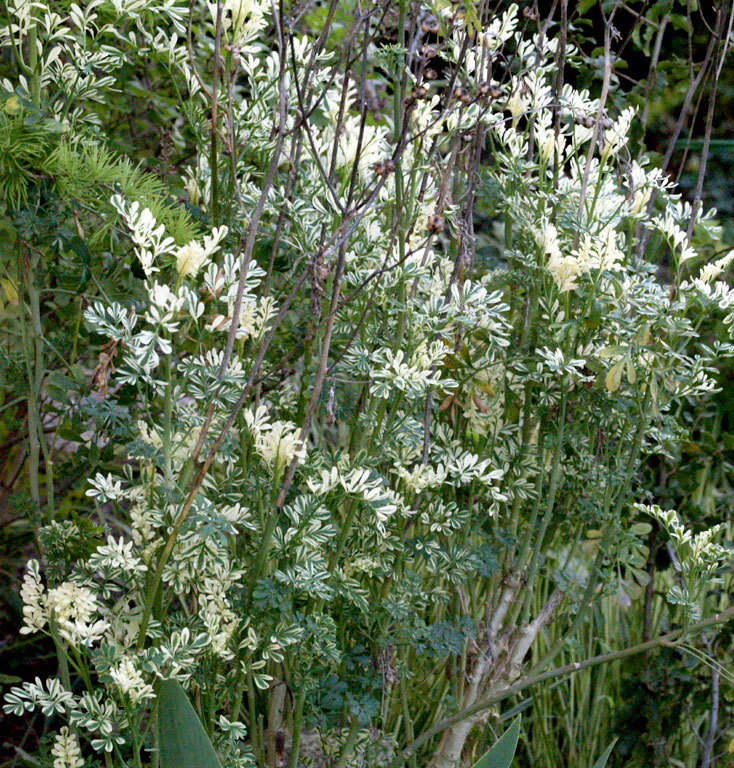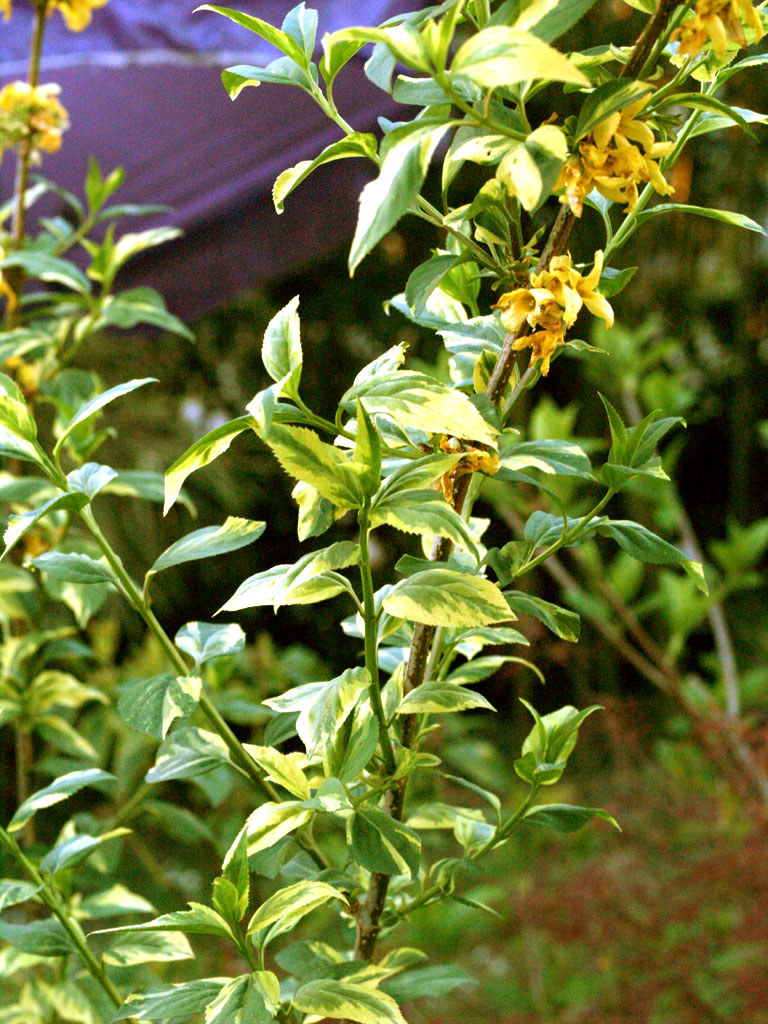 Die Blätter der panaschierten Forsythie sind im Austrieb leuchtender als die Blüten.