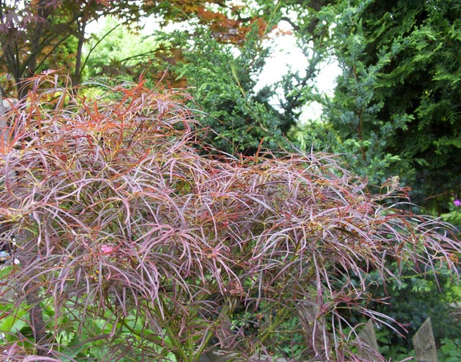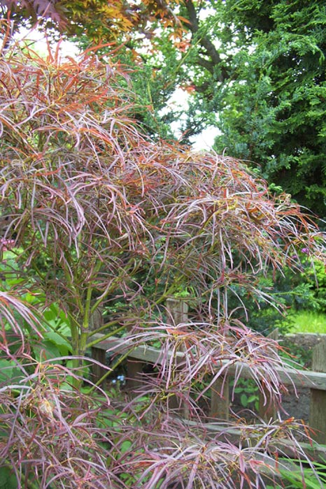 Acer Palmatum mit sehr tief geschlitzten blättern und interessanter rötlicher blattfarbe, im kontrast zu den grünen ästen, die auch den sommer über erhalten bleibt