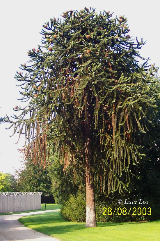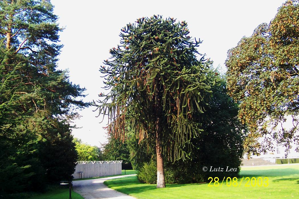 ich bin gerade bei meinen älteren Bildern auf eine chilenische Schmucktanne 'Araucaria araucana' gestoßen, die ich im August 2003 (ich meine ich hätte jene damals hier mal vorgestellt?) in Bonn fotografierte. Es war mir gelungen in den eigentlich nur zu ganz bestimmten Zeiten (Gelegenheiten) geöffneten Park der "Villa Hammerschmidt/Palais Schaumburg" zu gelangen!