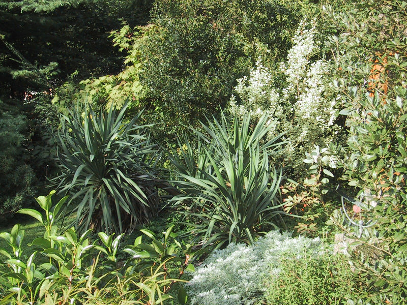 hi:Uralte Yucca recurv.(1 Exempl) neben Quercus phillyreoides und einer fast baumhohen immergrünen panaschierten:/*Rhamnus alaternus argenteovariegatus*/