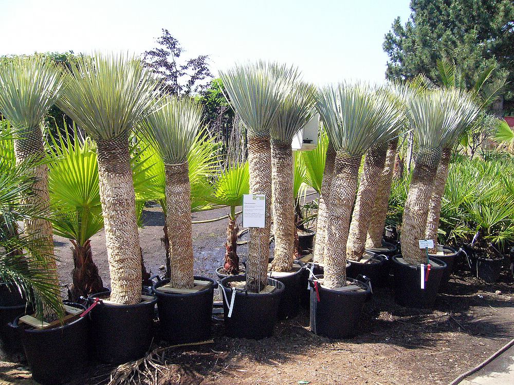 Hier eine der verschiedenen Gruppen von /*Yucca rostrata*/, alle Pflanzen noch nicht vollständig bewurzelt, aber offenbar schon so, dass sie im Kübel ohne Halt aufrecht stehen können. Im Hintergrund kleine Washis.
