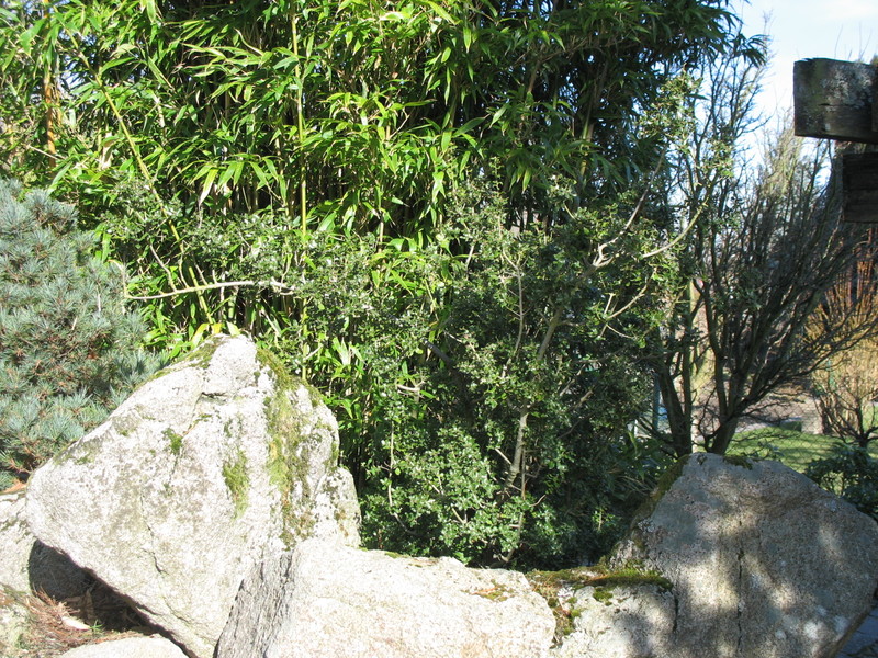 Quercus coccifera macht sich gut an schwierigem Standort. Pinus parviflora hat hier nach ca. 10 Standjahren im heißen Sommer 2003 versagt