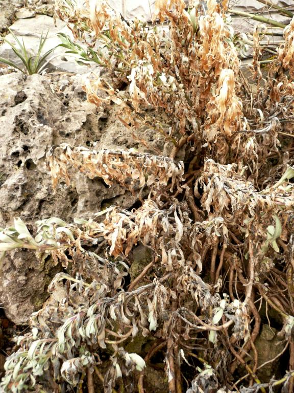 War trotz unfreundlichstem Wetter nochmal draußen und so sieht die Zone-9a/8b-Pflanze aus dem Sahara-Atlas nach einem Zone-6-Winter aus.