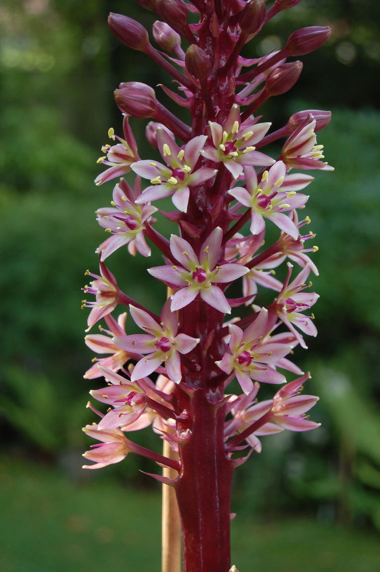 /*Eucomis comosa 'Oakhurst'*/ hat sich sogar in SH als winterhart erwiesen,fast 1m hoch mit yucca-ähnlichen, dunkelroten Blättern#AM