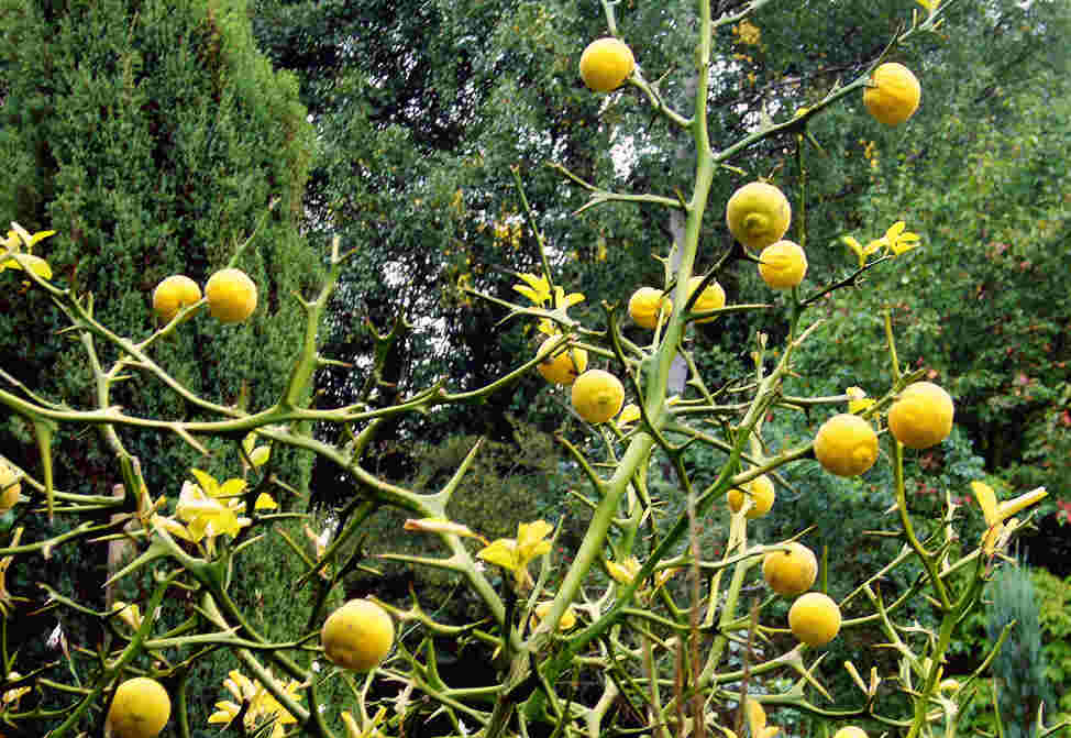Das hier bereits vorgestellte Exemplar der Bitterorange /*Poncirus trifoliata*/ hat nun reife Fruechte und faellt weithin auf. Ist jedenfalls hierzulande (NW-Dt) ein *Hingucker*.