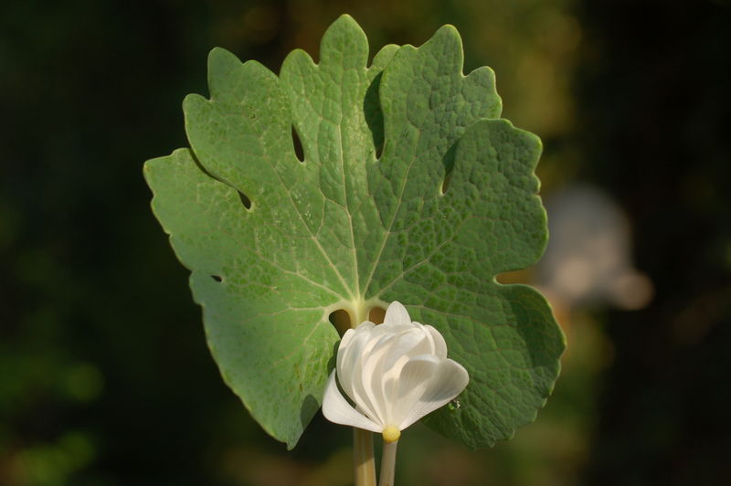 /*Sanguinaria canadensis fl. plen.*/ hat leider die Hälfte ihrer Blütenblätter verloren!