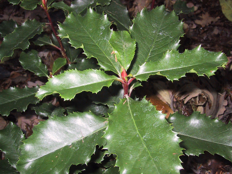 /*Photinia serrulata Curley Fantasy*/, eine sehr großblättrige Immergrüne mit welligen, gezackten Blatträndern u. feuerrotem Blattaustrieb