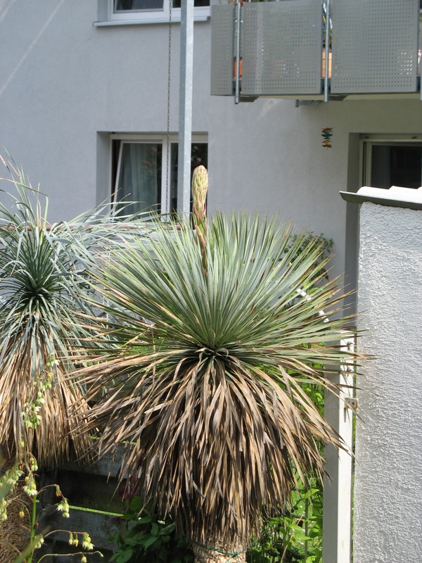 die Blüte dieser Yucca rostrata (seit Jahren im Kübel) schiebt sich langsam hervor