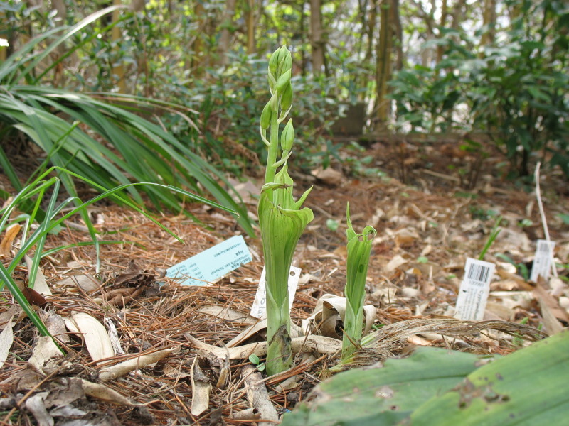 unten am Boden wirds wieder spannend, besonders im Schatten- und Halbschattenbereich. Hier erstaunlich weit entwickelt, will Calanthe oblanceolata die Orchdeensaison einleiten. Versehentlich gekauft und laut div. Quellen nicht winterhart, hat dieses "Schätzchen" die beiden letzten Winter problemlos gemeistert![]()