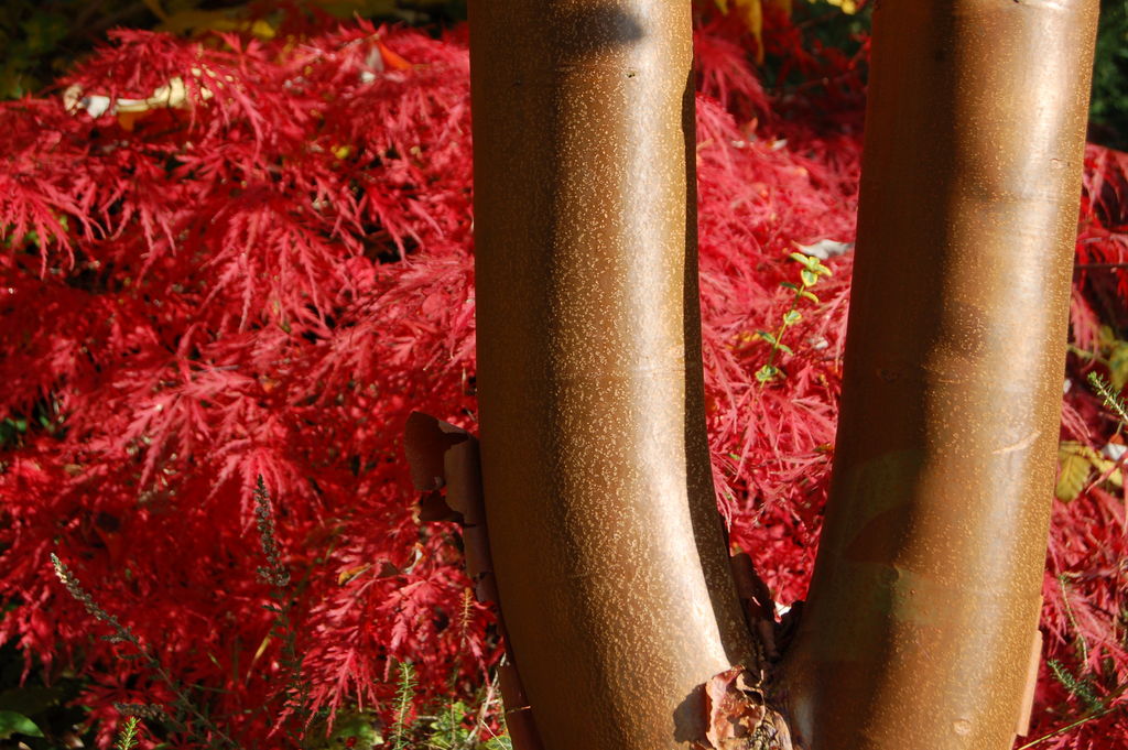 von /*Acer griseum*/ ist nicht zu vergessen.Dahinter Acer palmatum dissectum Garnet