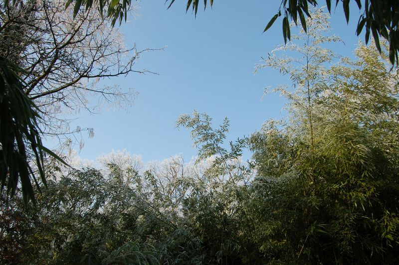 Phyllostachys-Hain (ca 12m X 10m X max 8m Höhe) neben Metasequoia. Im Hintergrund der mit Rauhreif bedeckte Eichenwald (allerdings nicht immergrün ;-)