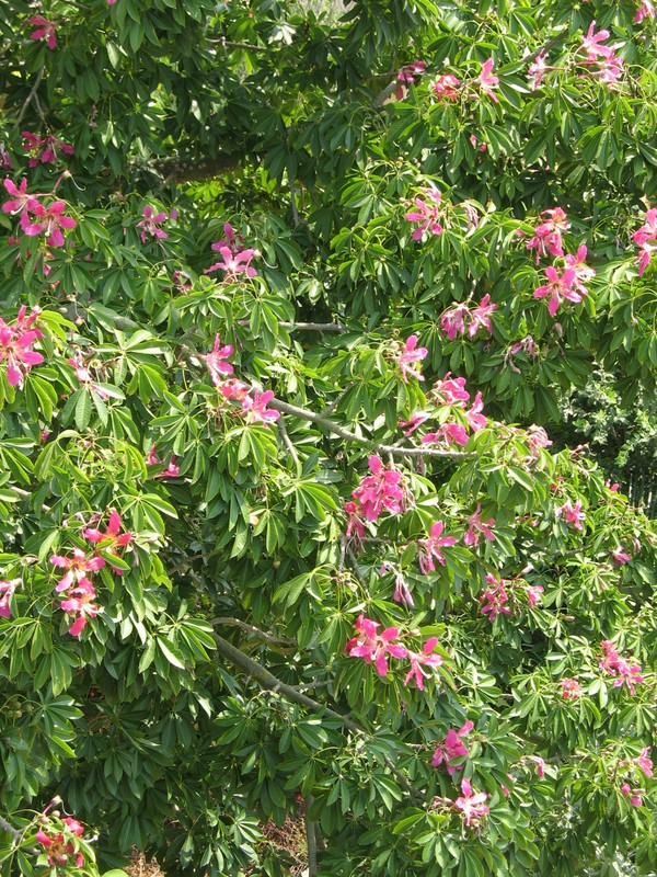 macht deutlich warum /*Chorisia speciosa*/ auch als "Orchideenbaum" bezeichnet wird. Eigentlich ein Glücksfall: normal erscheinen die Blüten im Oktober und später nach dem Laubfall, aber auch auf Mallorca ist die Witterung dieses Jahr etwas aus dem Tritt.
