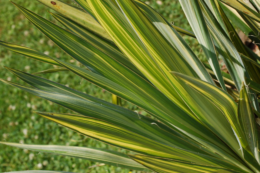 m.E. noch nicht beschriebene, panaschierte Yucca-Sorte,entstanden aus Yucca flaccida Golden Sword