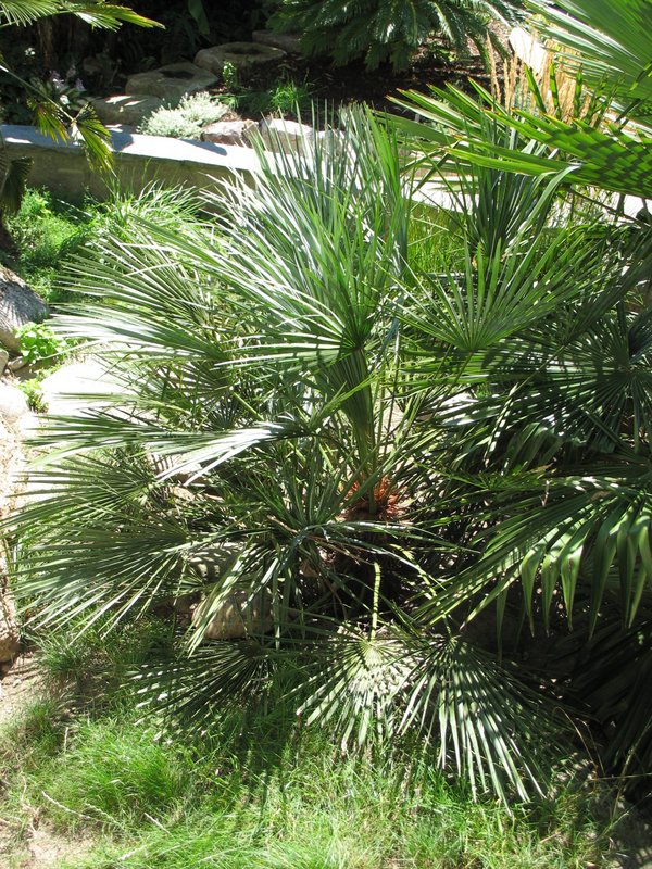 und noch eine Erfolgsstory: Chamaerops humilis var. cerifera, vor mindestens 12 Jahren als winzige Pflanze mit dem ersten geteilten Blatt gesetzt. Sah damals recht einsam aus, so groß war der Platz zwischen den einzelnen Palmen, aber mit der Zeit ......!!!!