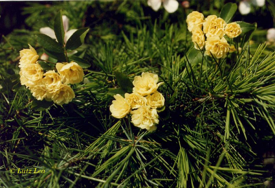 Ein eingescanntes Bild mit der gelb blühenden "Meran-Rose" - jene gedieh und kletterte bis 1996/97 in unsere mächtige Zeder 'Cedrus deodara'.