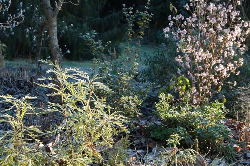 /*Lomatia tinctoria*/ und Daphne bholua neben einigen anderen Immergrünen