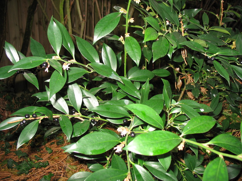 an Sarcococca orientalis. Vielleicht etwas früher als sonst mit der Blüte? Das Foto stammt zwar nicht aus meinem Garten aber S. orientalis gedeiht auch bei mir unterm Apfelbaum.