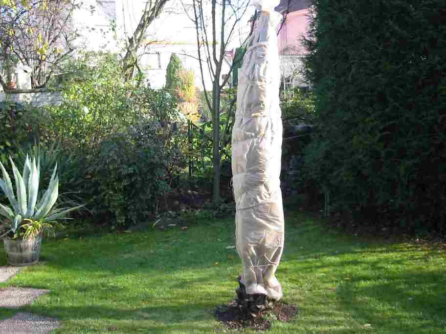 die Butia wird zusammengebunden und mit zwei Lagen Schutzvlies umwickelt.Der boden wir mit Laub gemulcht und bei starkem Regen mit einer Folie abgedeckt(starker Regen im Winter, sowie extreme Tiefstwerte, blieben allerdings seit dem auspflanzen im April 02 aus!)